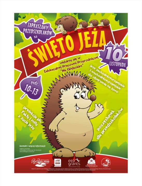 Serdecznie zapraszamy przedszkolaków do Edukacyjnej Pracowni Przyrodniczej "Na Głębokim" w dniu Jeża, by na żywo zobaczyć jeże wschodnio i zachodnioeuropejskie. Spotkaniu towarzyszyć będzie prelekcja nt. faktów i mitów z życia tych sympatycznych i dzikich zwierząt. Dla przedszkolaków przygotowaliśmy poczęstunek.
